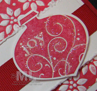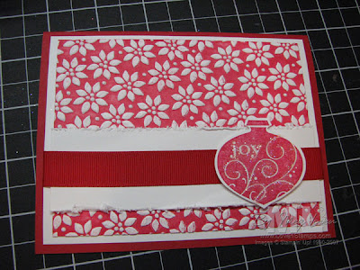 Here’s another idea for you. This is one done in Real Red with the NEW Petals A Plenty Textured Impressions Embossing Folder. The new Delightful Decorations stamp set from the Holiday Mini Catalog is also going to be a favorite of mine–it hasn’t left my stamping table since it came out of that big brown Stampin’ Up! shipping box!